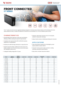 The CT series products are valve-regulated batteries designed for the telecommunications industry. With terminals at the front, these batteries are easy to install and maintained. Dimensions of the terminals fit in a 19-inch standard power cabinet.